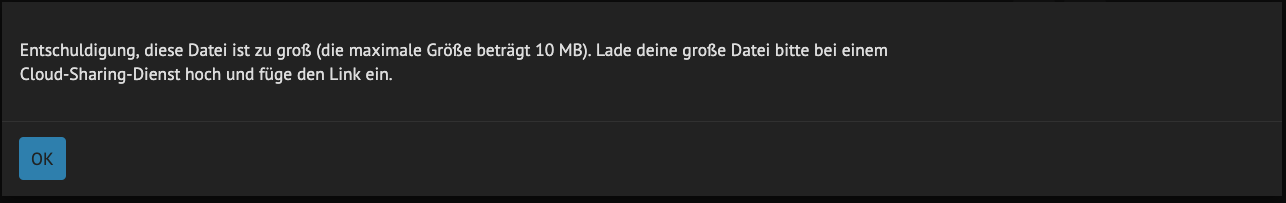 Ich habe jetzt etwas getrickst. Wenn ich von meinen Bildern auf meinem Linux Rechner einen Screenshot erstelle, dann funktioniert der Upload. Die Dateigröße beträgt jetzt nur noch 1,8 MB. Die Bildqualität fällt jetzt entsprechend gering aus. ![]()