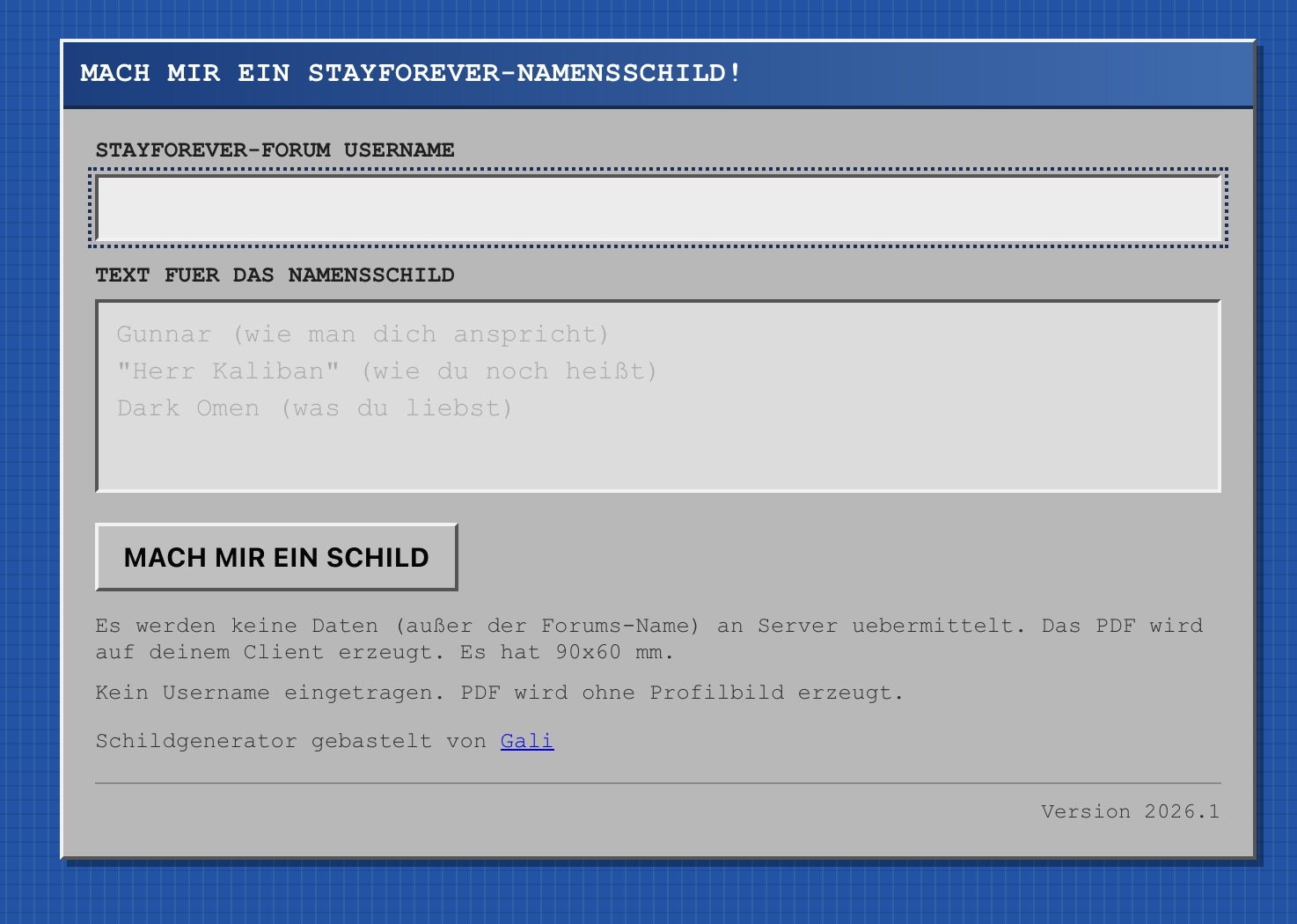 Neben einem offiziellen Namens-Button und der Community-Bingo- Karte, die im letzten Jahr als „Eisbrecher“ in der Begrüßungs-Tüte am Eingang gereicht wurden, existiert seit 2024 ein Namensschild-Generator, den der großartige @Gali entworfen und mittlerweile noch erweitert hat.