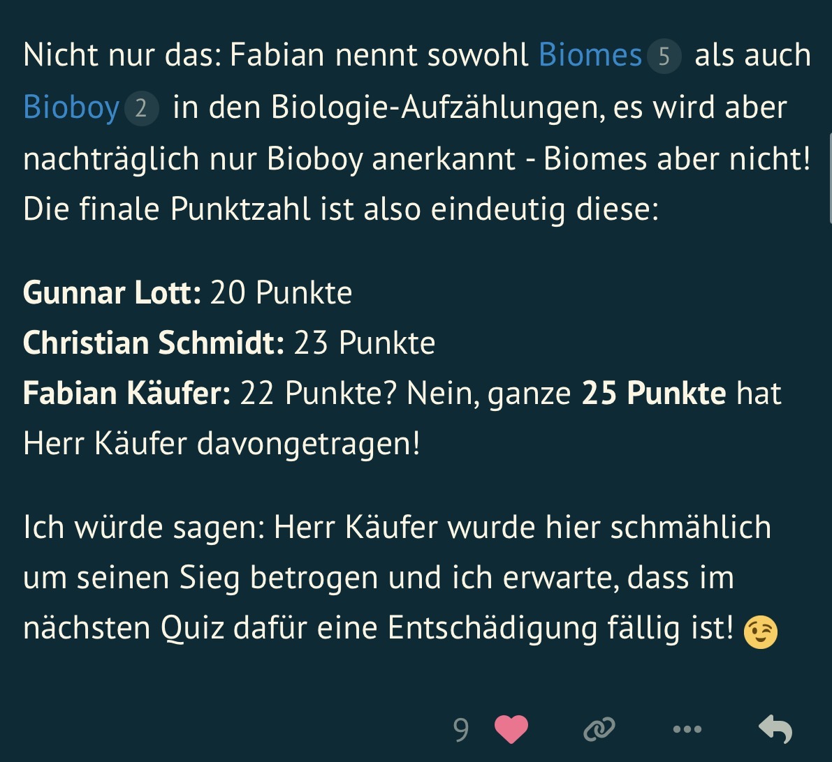 Klar ist das alles nur Spaß, aber das hätte Herr Beuster ja irgendwie humorvoll aufnehmen können. Und auch wenn es um nix geht - @Fabian wurde hier um den verdienten ersten Sieg gebracht ![]()