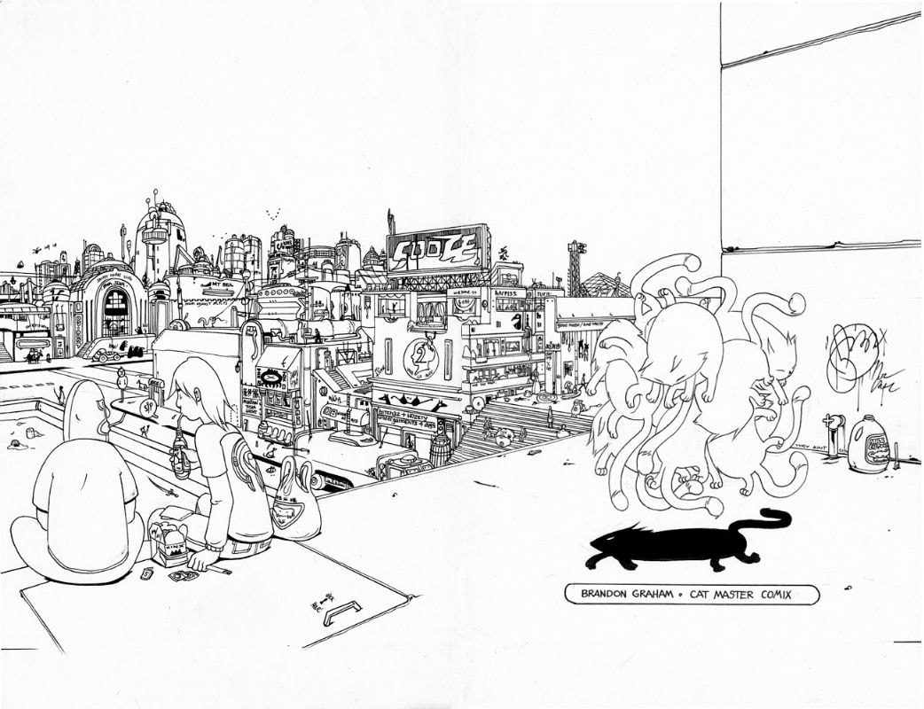 „King City“. Das kam mir vor Jahren durch eine Cory-Doctorow-Empfehlung unter und ist wunderbar dämlich-abgefahrener Spaß über eine Verschwörung in King City und einen cat master, der alles von seiner multifunktionalen, super-intelligenten Katze lösen lässt. Eine wirklich sehr komische Reihe an Erzählungen, die mich prustend zum Lachen brachte, manchmal ganz schlimme Wortspiele auffährt und auch den Zeichnungen, gerade manchen der Wimmelbilder-Panels wirkt, als wäre es dem Mad Magazine entsprungen.