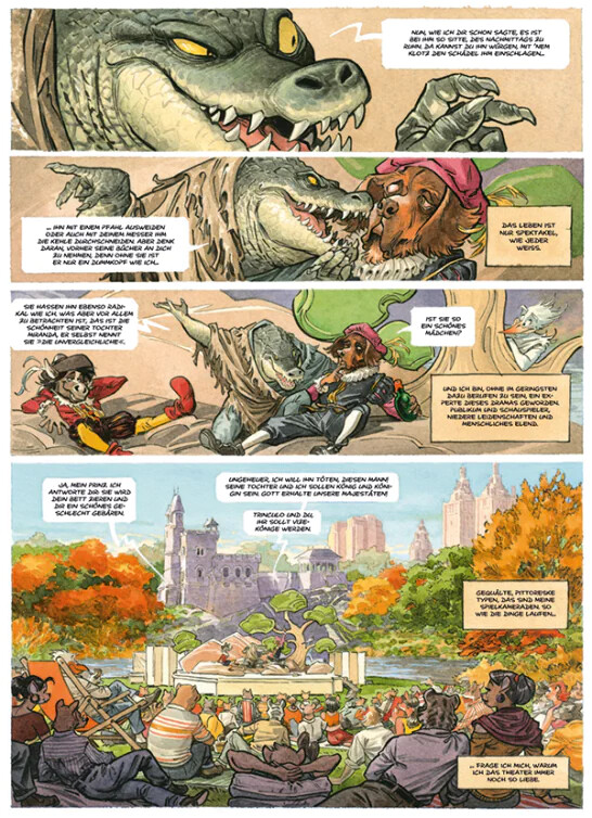 „Blacksad“. Eine fantastische „Hardboiled detective“-Geschichte in einem frühen 20. Jahrhundert, aber alle Figuren sind anthropomorphe Tiere; wie das lovechild eines Film noir und König der Löwen. Die großartige Besetzung welche Figuren von welchen Tiere dargestellt werden (der cholerische Walross-Manager ist wohl mein bisheriges Highlight), der barocke Detailgrad vieler Panels, der punktgenaue Tonfall. Ein Genuss für alle, die etwas mit diesen tropes anfangen können und jetzt auch schon sechs Teile auf Deutsch (ursprünglich von zwei Spaniern auf Französisch publiziert, weil das der bessere Comics-Markt ist)