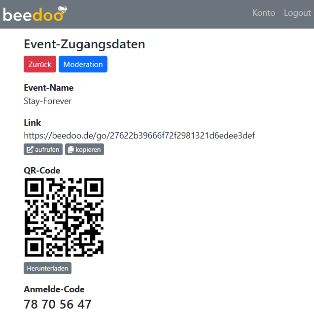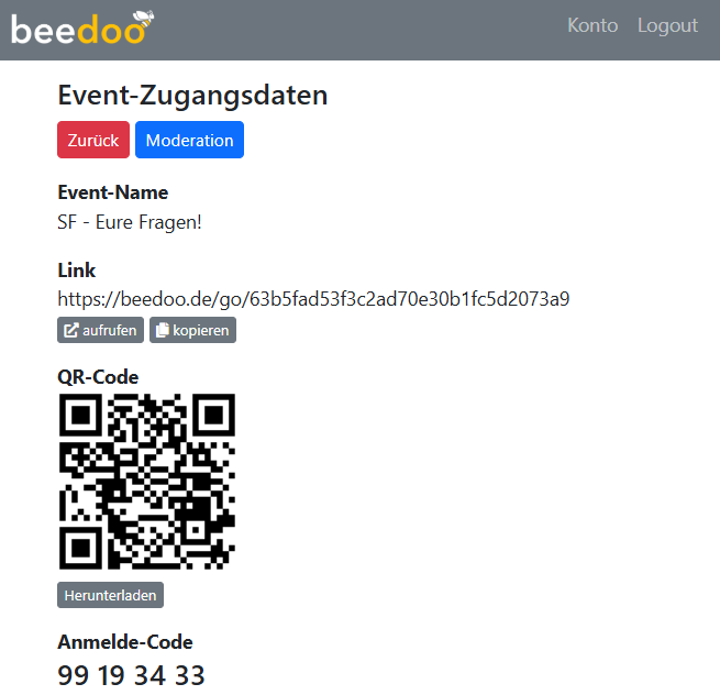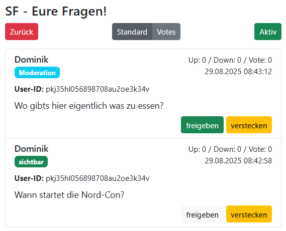 Ein Beispiel, wie es funktioniert. Ihr erstellt ein Event “Question-Vote”. Euer Publikum kann einen QR-Code scannen und Fragen einreichen. Ihr gebt diese kurz als Moderator frei und anschließend gehen diese ins Voting. Alle, die sich per QR-Code einloggen, können nun die Fragen hoch- oder runtervoten. Am Ende habt ihr eine Liste mit den Top-Fragen, die dann z.B. auf der Bühne den Gästen gestellt werden können.