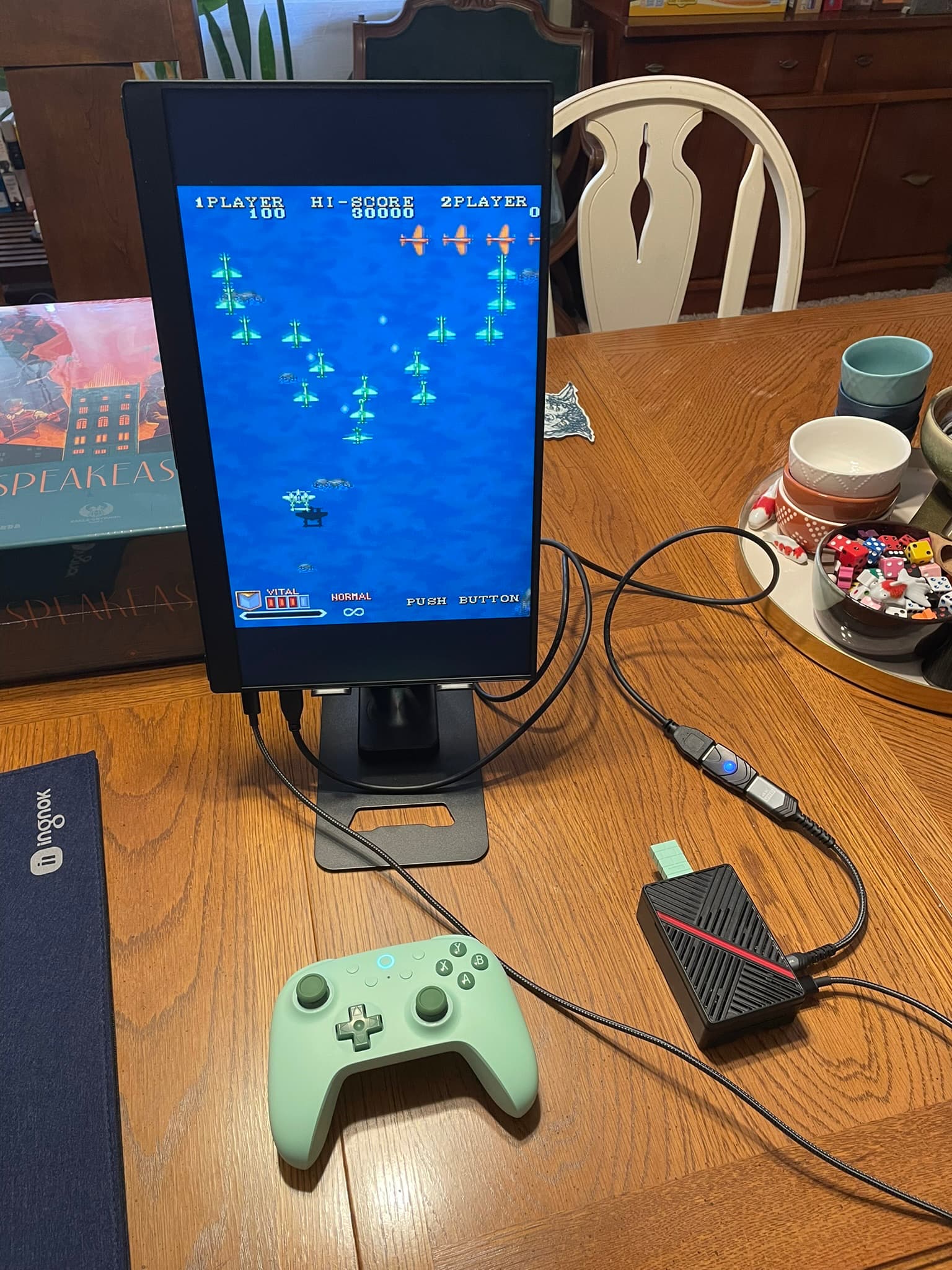 Da der kleine Monitor in der Halterung nur liegt, kann man ihn wunderbar umdrehen um Spielhallenshmups wie Raiden 2 vertikal zu spielen: