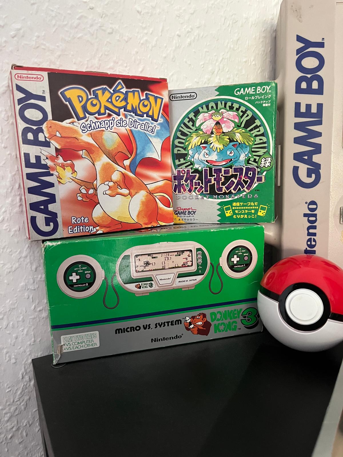 - Meine Pokémon Rote Edition, die ich damals selbst gekauft habe. Dazu Pokémon Grün, das erste Pokémon-Spiel, das jemals in Japan erschienen ist, und Donkey Kong 3 Game & Watch.