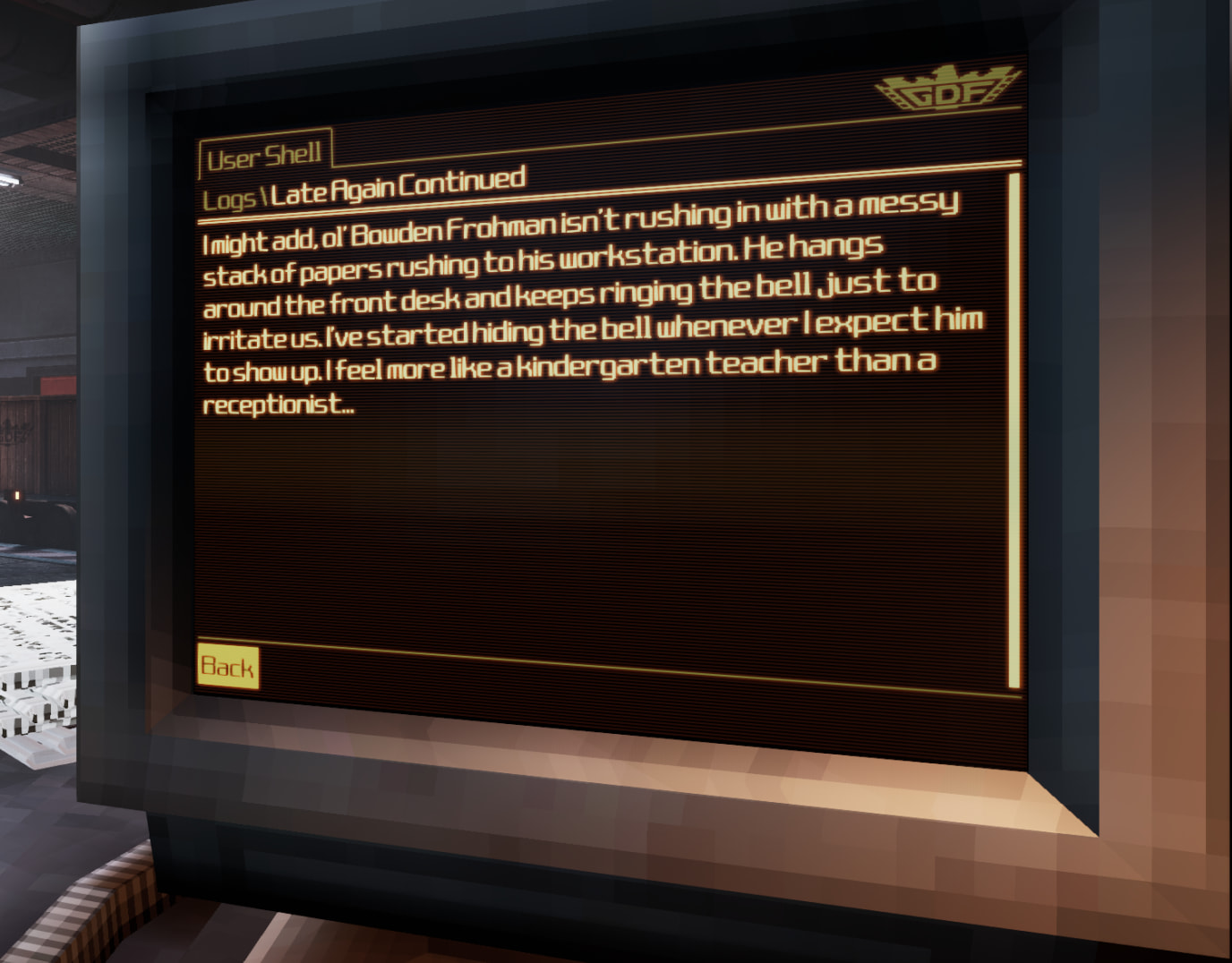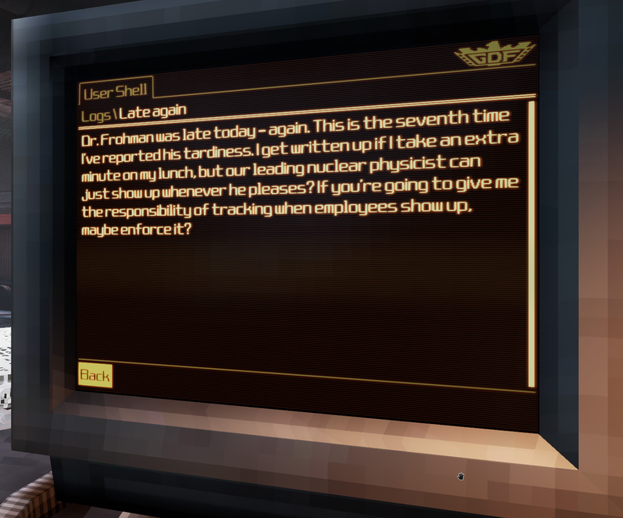 In einem Level muss man sogar durch eine geheime unterirdische Forschungsanlage, um einen speziellen Anzug zu bekommen und Regierungssoldaten versuchen einen aufzuhalten. In einem der diversen Log-Nachrichten, die man findet beschwert sich jemand über einen gewissen Dr. Frohman, der immer zu spät kommt und die ganze Zeit am Empfang steht und die ganze Zeit auf die Klingel drückt um die Leute zu ärgern ![]()