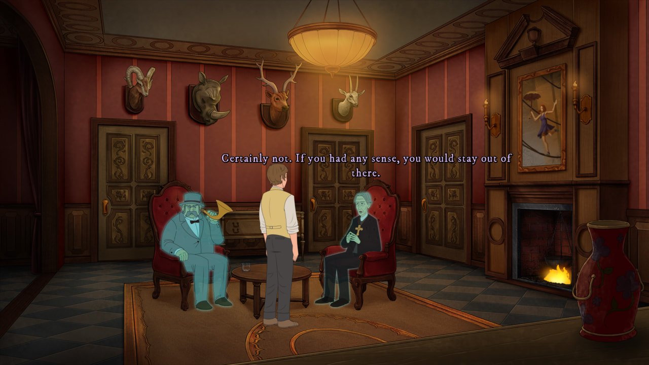Von den Production Values her wirkt Foolish Mortals wie ein dtp-Titel aus dem Jahr 2004 oder so. Die Hintergründe, mit ihrer angenehmen Farbpalette, sind ordentlich gezeichnet, aber ein bisschen zu “gradlinig” und zu statisch, die Charaktere schön animiert, aber kämpfen mit der Skalierung und treffen nicht ganz den Stil der restlichen Grafik.