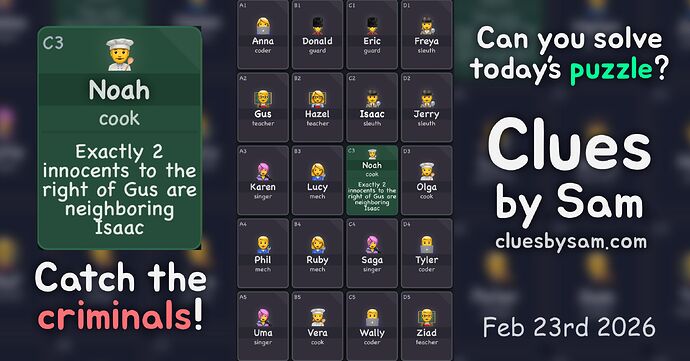 Danke für den Tipp. Habe jetzt einige Runden gespielt und es ist echt spaßig. Aber kann es sein, dass es öfters vorkommt, dass die Hinweise in’s Leere laufen bzw. nicht eindeutig sind? Hatte nun schon 2x eine partie, wo ich nur noch durch brute force ein neues Feld aufdecken konnte und keiner der Hinweise zu einem logischen Schluss führten, selbst nachdem ich die Person identifiziert hatte.