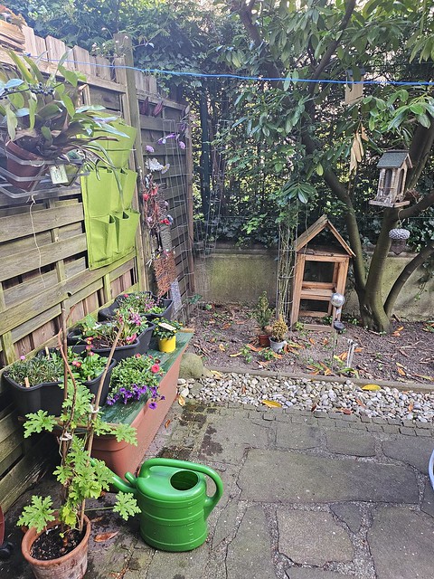 Blick auf meinen kleinen Garten/Terrasse in Bayern. Die Pflanzen freuen sich, weil sie endlich schönes Wetter haben.